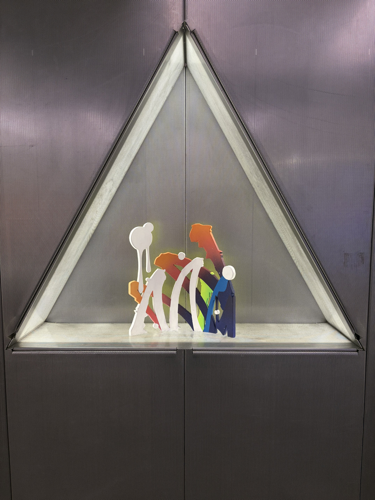 Yuya Saito’s works lean heavily into urban street culture as an inviting space for those seeking a space of community, a theme that is relevant to both the urban realities of Tokyo and New York. “Flow-architecture” is the term used here to describe Saito’s work in which the material and symbolic embodiment of the ramp becomes the creative vehicle for his practice. Since the ramp as a motif is synonymous with skate culture, it should be mentioned that ramps as a platform upon which one moves is intended to not only provide ease of access, but also a sense of agency and command over one’s actions and movements. Saito’s painted ramps are elaborately colorful surfaces that glow with bold shapes and gestures in direct homage to the vibrancy of urban street art graffiti.